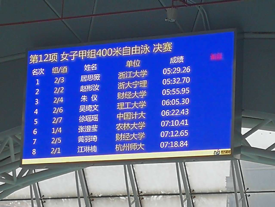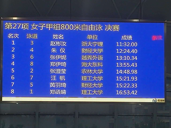 我校游泳队在领队朱天明、主教练洪煦老师带领下,经2天的激烈角逐,最终我校生化学子赵彬汝同学在女子甲组800米自由泳决赛中以11:32:00的成绩勇夺冠军,在女子甲组400米决赛中以5:32:70屈居亚军,这是我校游泳队时隔4年后再次在浙江省大学生游泳比赛中夺冠。