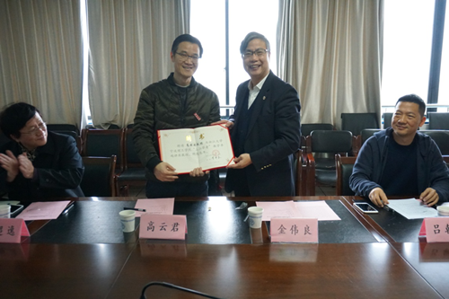 聘任仪式上,人事处处长吕朝晖介绍了高云君教授的个人简历和主要业绩,并宣读了聘书。金伟良院长向高云君教授颁发了聘任证书,并为其佩戴校徽。金院长对高教授加盟我校表示热烈欢迎,向高教授介绍了学校概况及发展规划,同时希望高教授能带领数据学院加大加快发展步伐,加强学科建设,培养创新团队,推进大数据专业建设,多出成果、出好成果。高教授感谢学校、学院对他的信任和支持,表示将尽快开展浙大团队与数据学院对接,筹谋平台搭建,积极开展相关领域的科学研究和学术交流活动,争取早日取得工作成效。