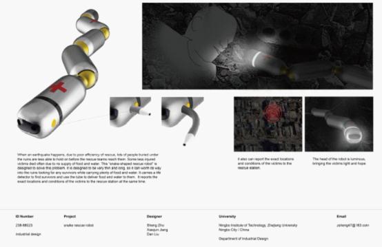 这次由浙江大学宁波理工学院传媒与设计学院工业设计07级祝晟同学设计,张峰老师指导的作品“Snake—Rescue Robot”(ID Number 288-88023)从来自全球10500份参赛作品的中脱颖而出,成功入围2012年“IF概念产品设计奖”。