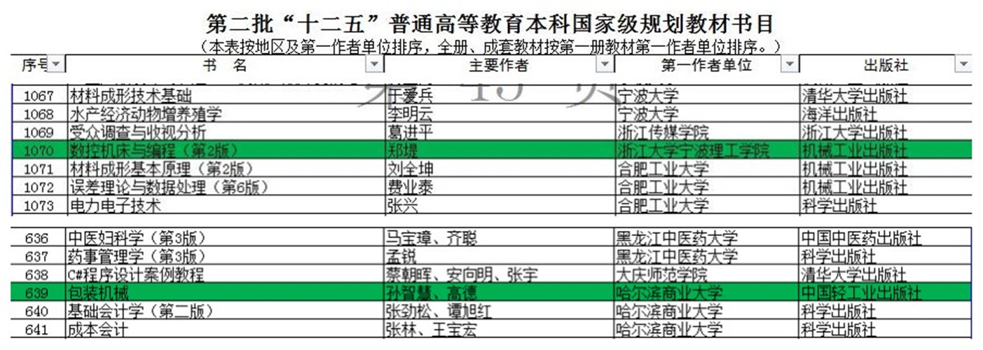 近日教育部下达了关于印发《第二批“十二五”普通高等教育本科国家级规划教材书目》的通知,我校机能学院选送的两本教材成功入选。分别是以我校为第一作者单位郑堤教授主编的《数控机床与编程》以及我校作为第二作者单位高德教授主编的《包装机械》,并分别由国家级出版社机械工业出版社和中国轻工业出版社出版。