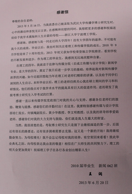 王润对大学期间老师们精彩的讲课,给予同学们深刻的人生启示铭记在心;硕士期间,老师们一如既往地指点,对其学术水平的提高起了巨大的促进作用,也使得他坚定了在学术道路上前行的信心。信中表示“我要特别感谢传媒与设计学院邵培仁院长、何镇飚副院长、黄少华教授、李文明教授以及我的班导师季爱娟老师”。王润同学时刻关注着理工和学院的发展,欣闻我校十周年校庆,2013年荣登独立学院榜首等喜讯感到无比自豪,也祝愿理工的明天更加美好。“我将继续勤奋努力,为母校增光!我不会忘记母校对我的培养,有空常回来看看”。