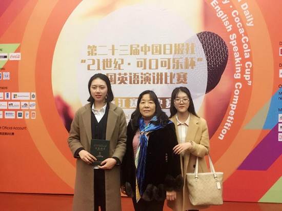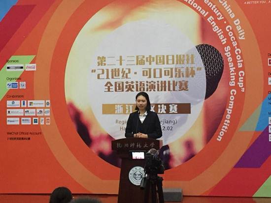 2017年12月1日至2日,我校外国语学院15级英语专业杨舒婷同学代表学校参加了杭州师范大学承办的第二十三届中国日报社“21世纪•可口可乐杯”全国英语演讲比赛浙江地区决赛,获得佳绩,荣获一等奖。
