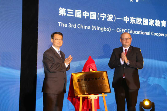 6月10日下午,第三届中国(宁波)-中东欧国家教育合作交流会在宁波市喜来登酒店举行。此次交流会邀请了来自10多个中东欧国家的政府、院校代表和国内院校代表共250余人参会。会上,我校与波兰驻沪总领馆、波茨南密茨凯维奇大学合作共建的波兰语言文化中心正式揭牌,波兰驻沪总领事彼得·诺沃特尼亚特、宁波市教育局局长沈剑光为中心揭牌。