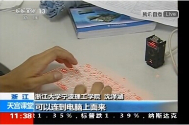 信息学院计算机101班沈泽涵同学被CCTV13新闻频道采访报道。沈泽涵同学一直以来认真学习专业知识,并运用专业知识制作小发明,比如马桶报警器、空调无电加湿器、无线充电器、折叠LED屏等,图为沈泽涵同学用自己制作的激光投影键盘在打字。