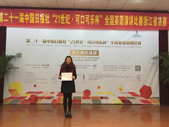 由中国日报社、可口可乐大中华区联合主办的“第21届中国日报‘21世纪•可口可乐杯’全国英语演讲比赛浙江赛区总决赛于2015年12月5日在浙江大学城市学院圆满落幕。我校英语131班汤洁清同学代表学校参加比赛,获得浙江省三等奖。指导老师阮巴燕老师获得优秀指导老师浙江省三等奖。