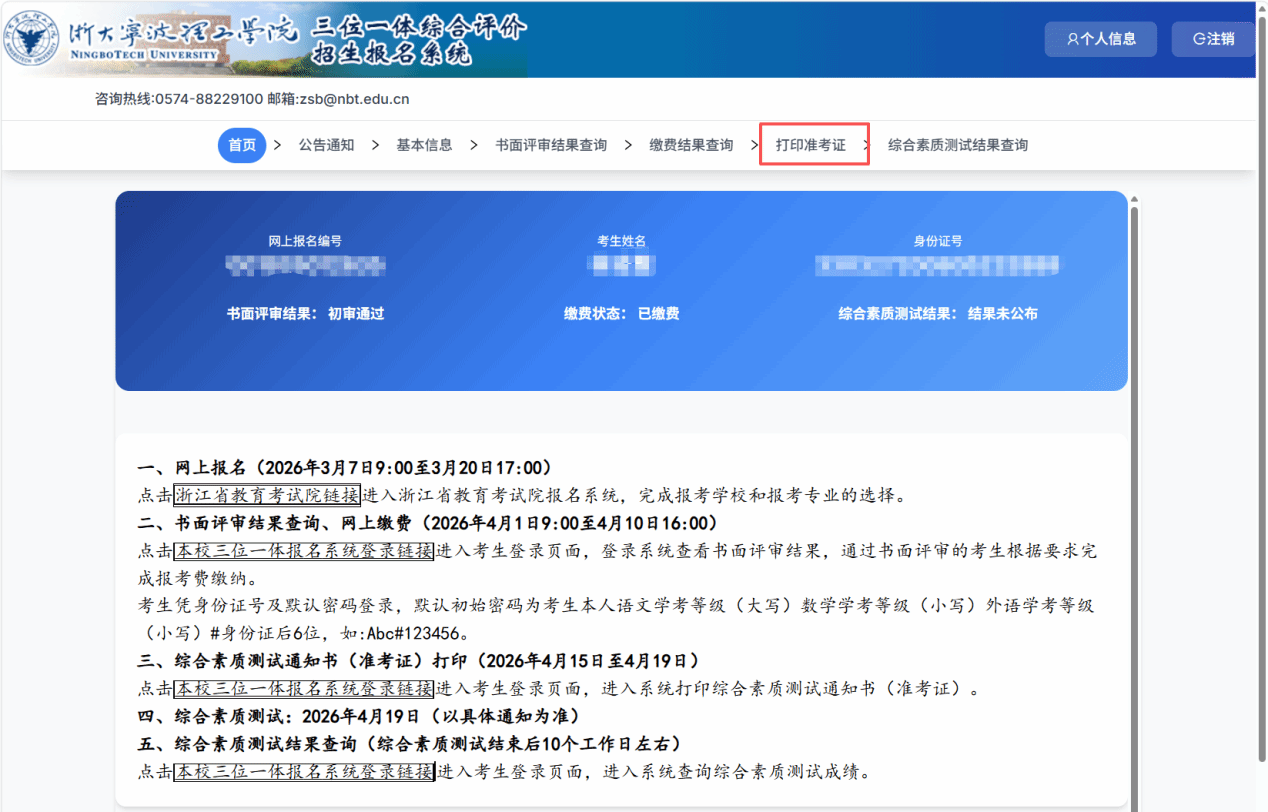 综合素质测试通知书打印时间:2026年4月15日至4月19日。考生可于4月15日起通过我校三位一体报名系统打印准考证。
