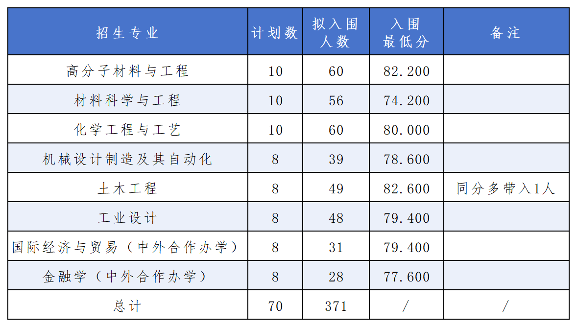 根据浙江省教育考试院有关文件和《浙大宁波理工学院2026年“三位一体”综合评价招生章程》规定:按照综合素质测试成绩从高到低,不超过专业招生计划数6倍的比例确定入围考生名单(最后一名同分均入围原则)。经三位一体招生综合素质测试、统分及成绩汇总工作,共有371人最终拟入围。各专业入围情况如下: